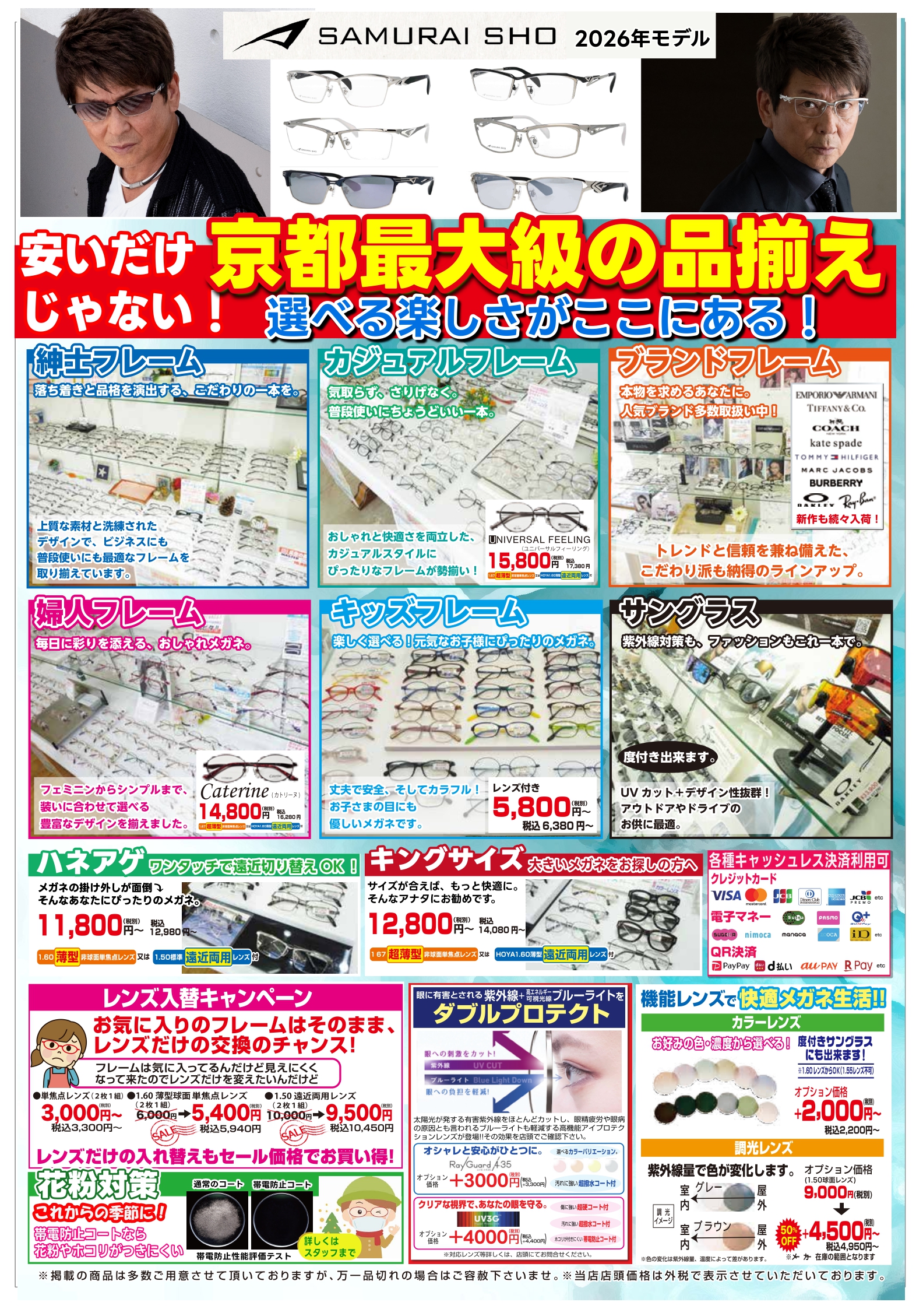 1.50標準遠近両用 又は1.60薄型非球面レンズ付、2本で15,000円 (税込16,500